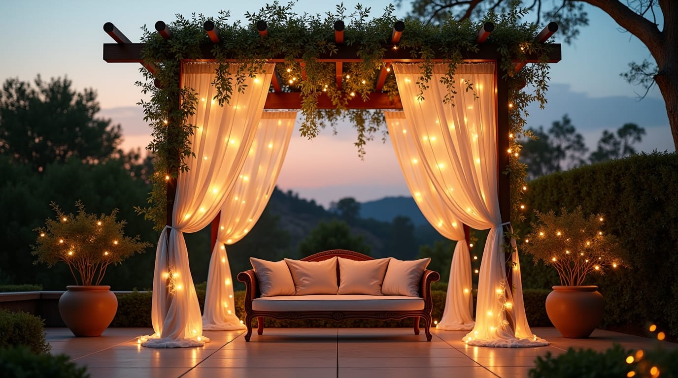 A compact pergola over a corner creates shade and structure. Add string lights, climbing vines, and a loveseat for instant charm.