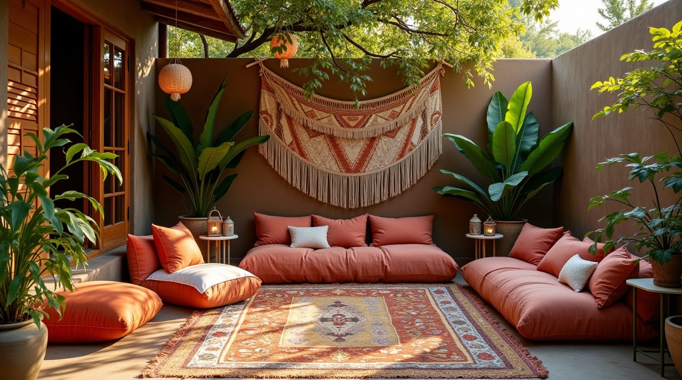 Place layered rugs, oversized floor pillows, lanterns, and plants for a relaxed, bohemian vibe.