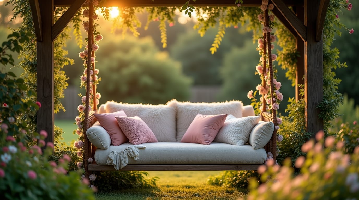A classic porch-style swing adds charm and relaxation. Perfect for unwinding after a long day.