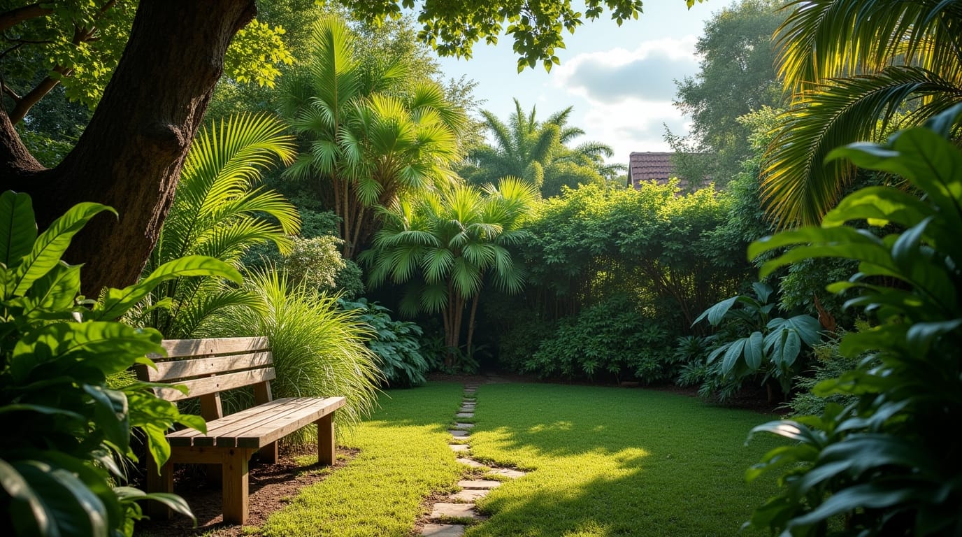 Fill the corner with ferns, hostas, palms, or tall grasses. Add a bench to create a shady escape.