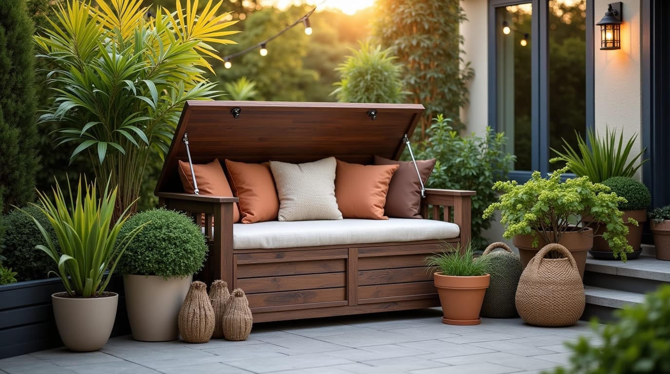 Make the space functional with hidden storage. A stylish wooden storage bench doubles as cozy seating.