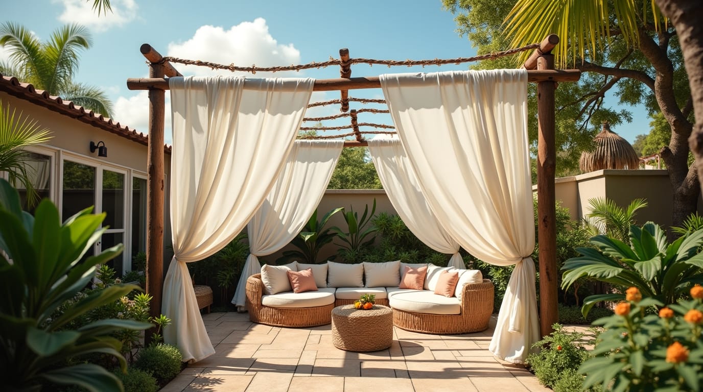 Drape curtains around a corner pergola or a simple rod setup. They add coziness, softness, and a breezy, beach-house feel.