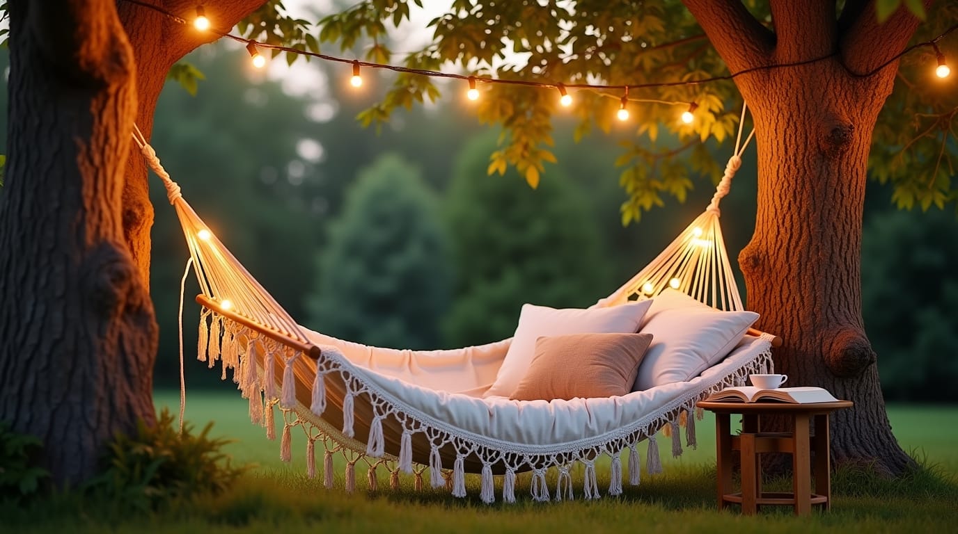 A hammock instantly adds relaxation vibes. Add a side table, hanging lanterns, and soft throws for a peaceful napping or reading zone.