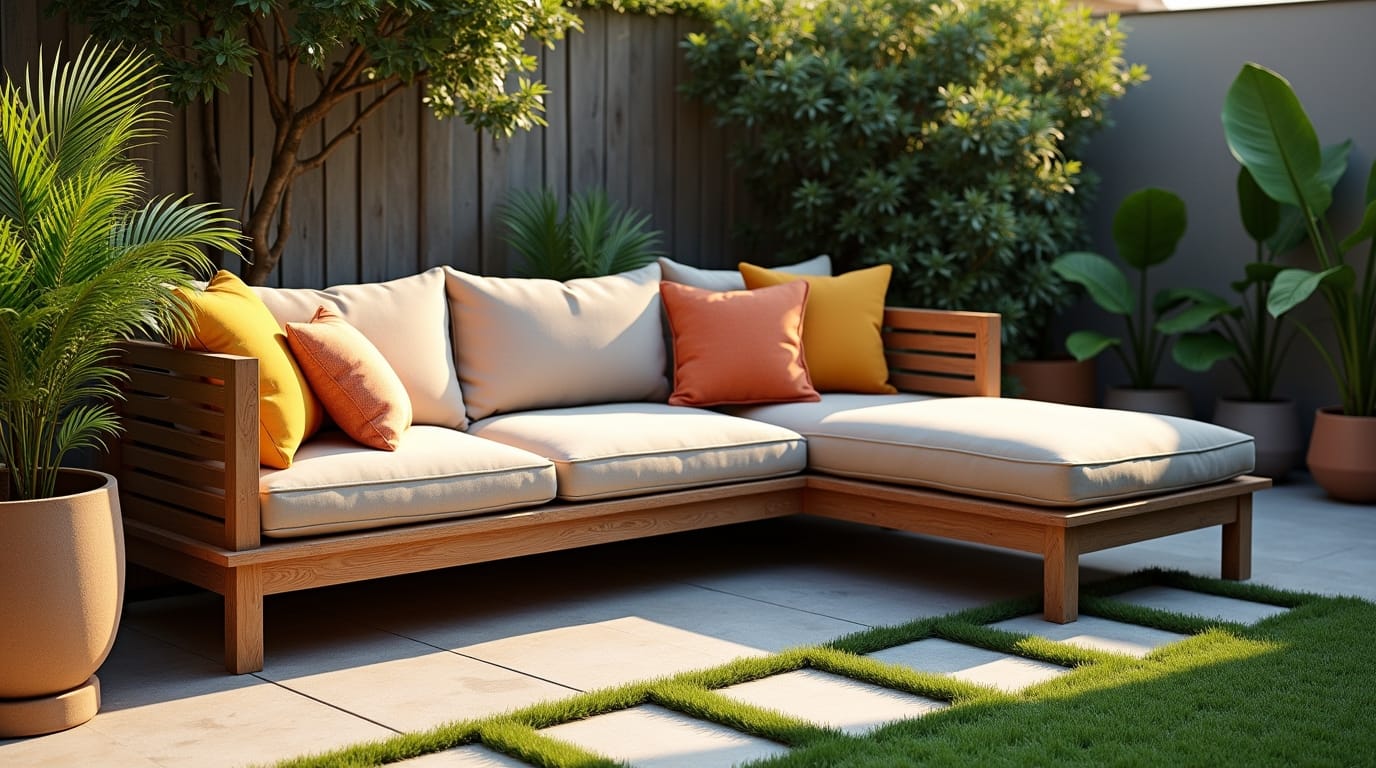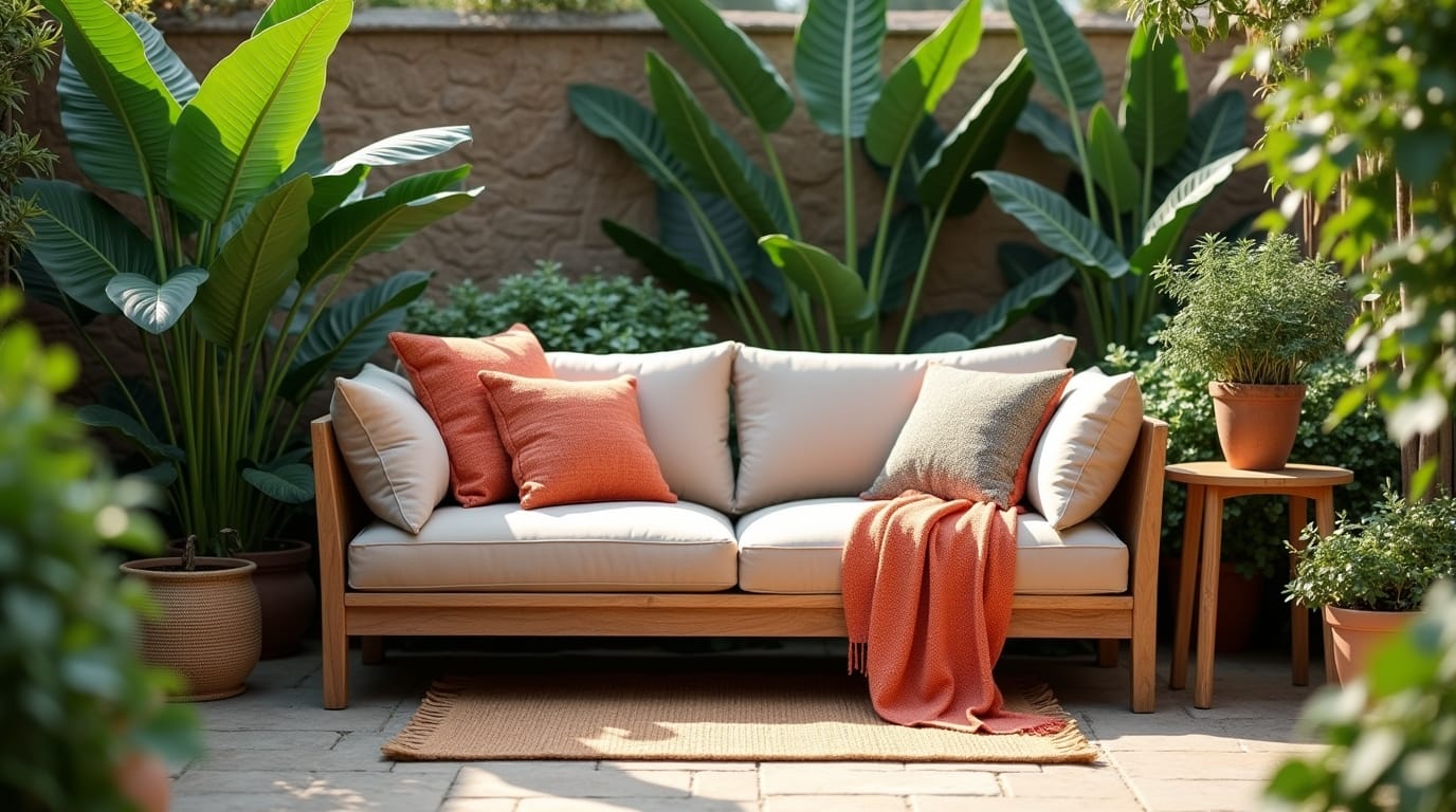A compact garden sofa fits perfectly in a corner. Style it with throws and outdoor cushions for instant comfort.
