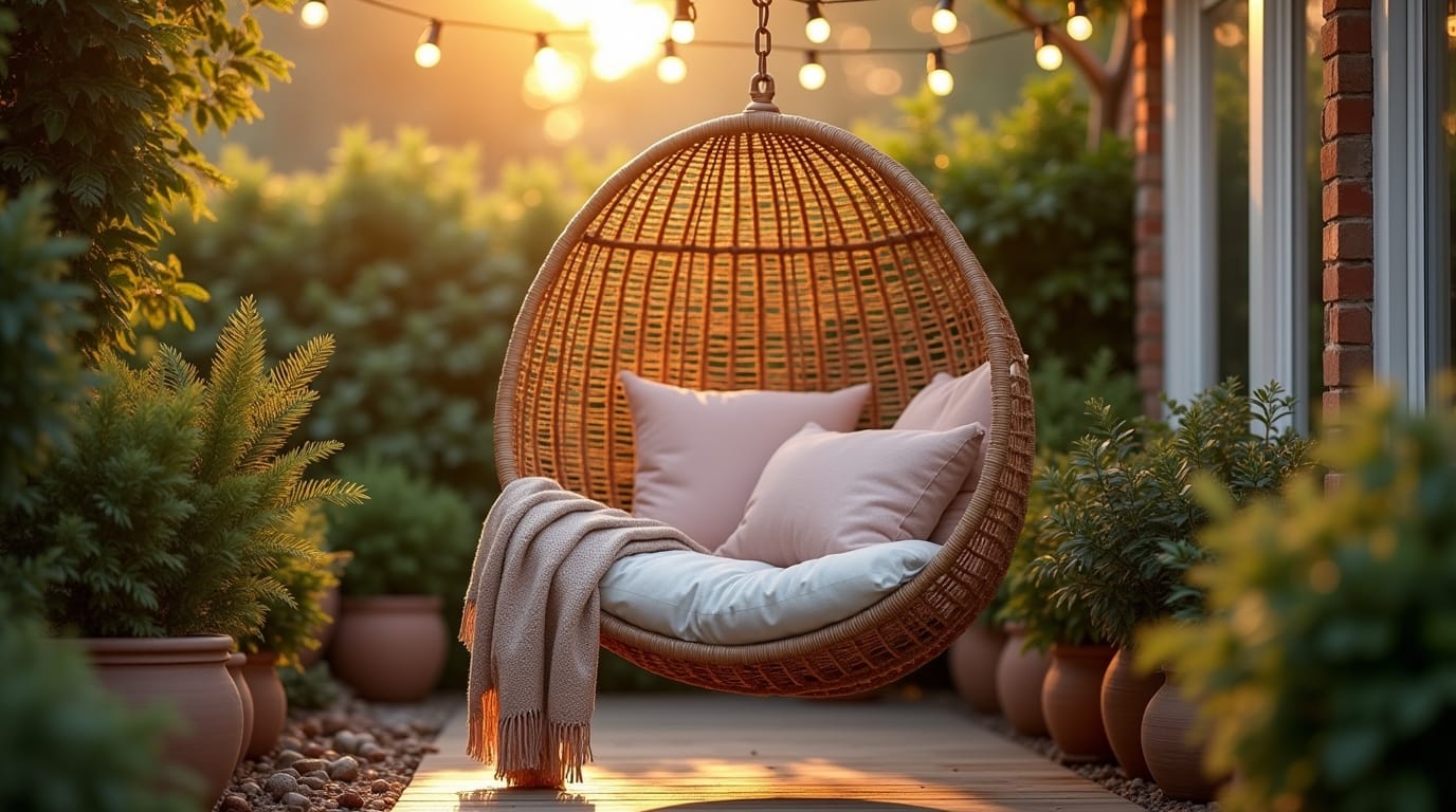 Egg chairs instantly make a corner feel cozy. Add a lantern, a side table, and soft pillows for a picture-perfect nook.