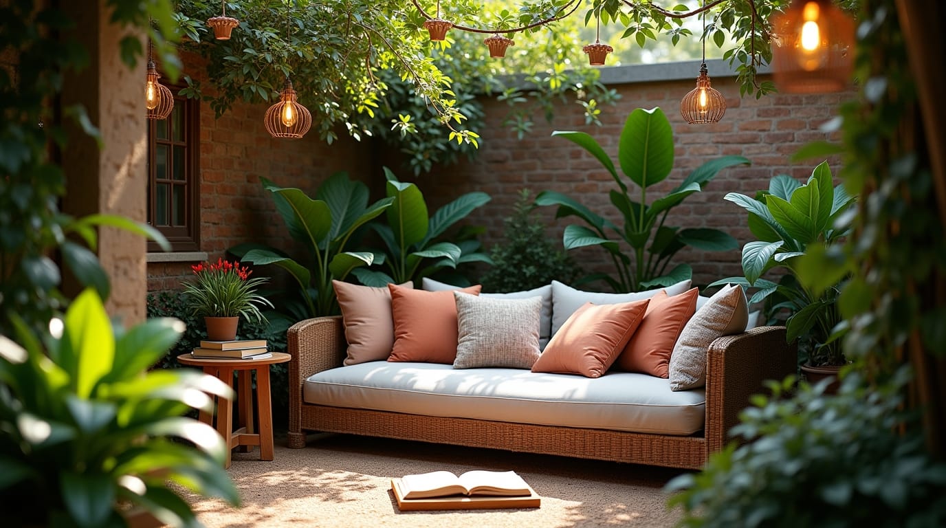 Place a comfy chair or outdoor daybed tucked behind plants or a privacy screen. Add a small bookshelf or crate table to complete the reading nook.