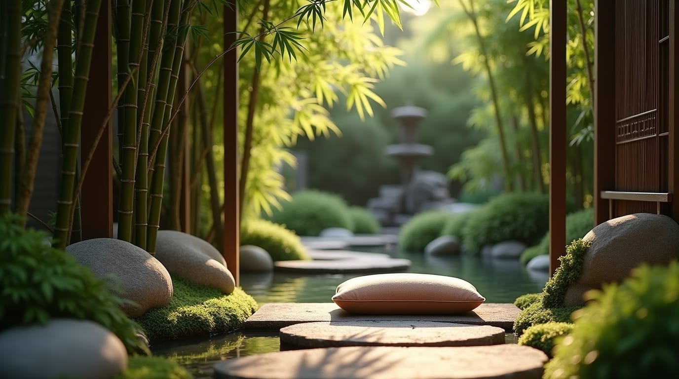 Add a floor cushion, mat, or meditation stool. Surround it with bamboo, potted plants, wind chimes, and stones to enhance peaceful energy.