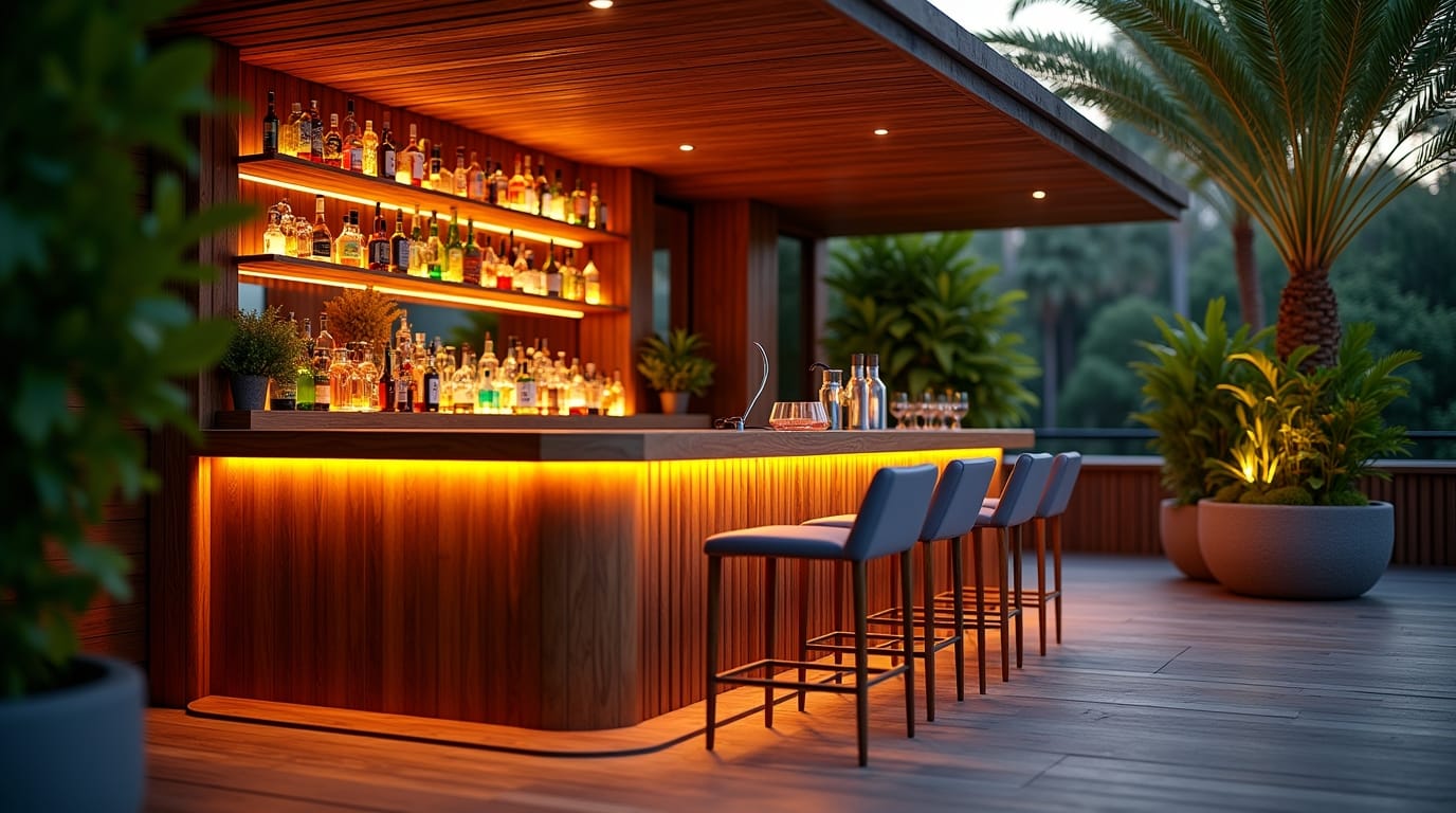 A triangle-shaped bar counter in the corner is perfect for entertaining. Add stools, floating shelves, and LED lights for a backyard party zone.