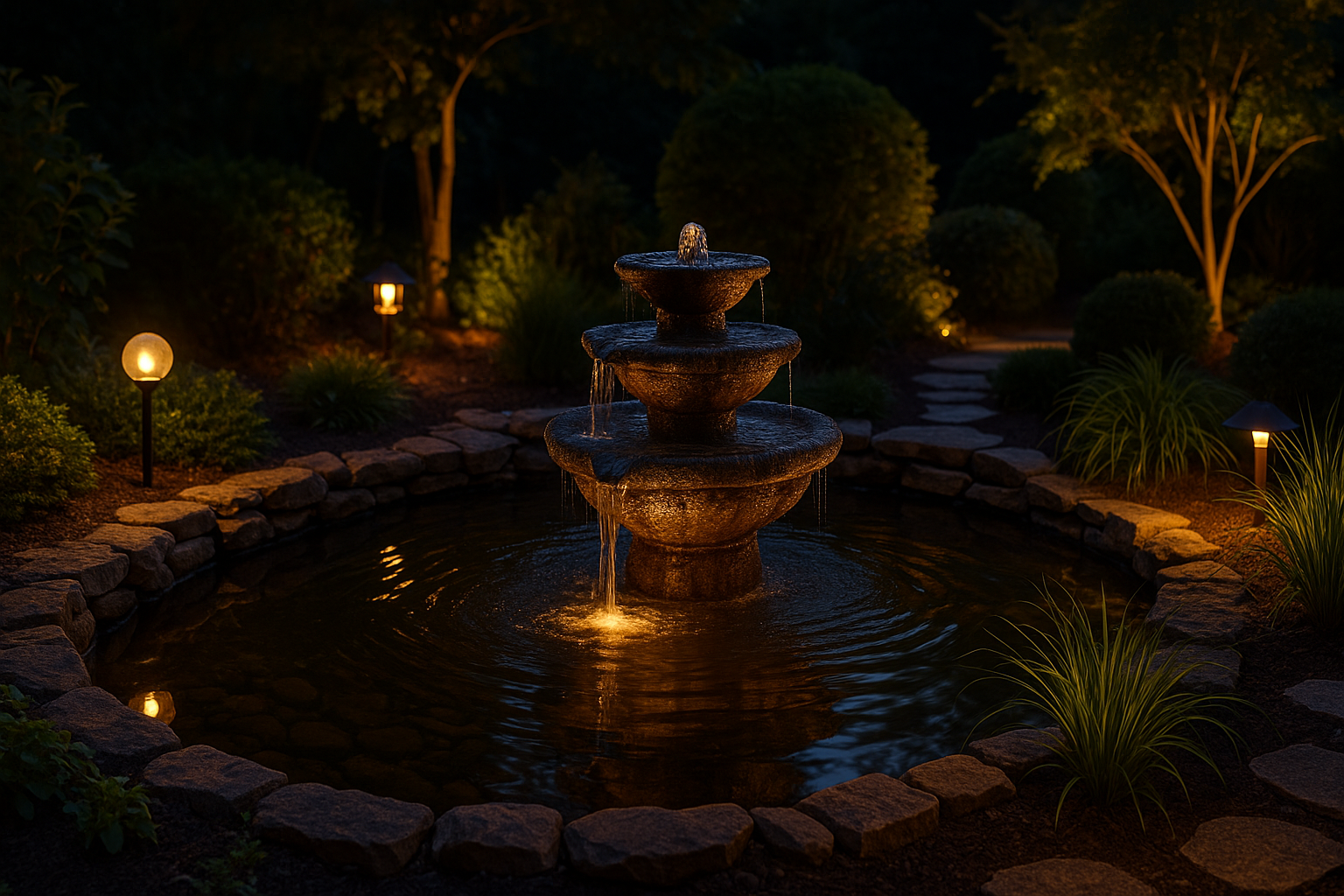 Underwater or pond lights can make fountains and ponds shimmer beautifully at night.