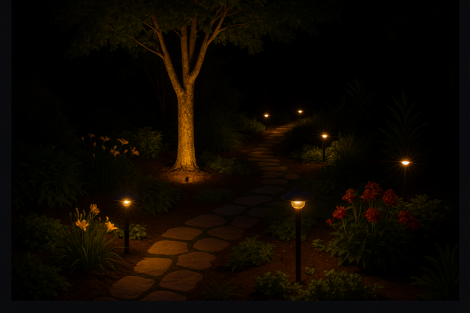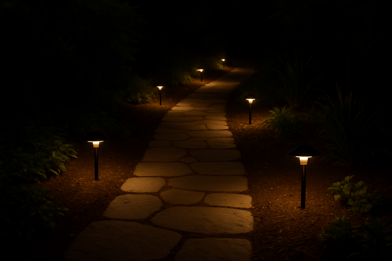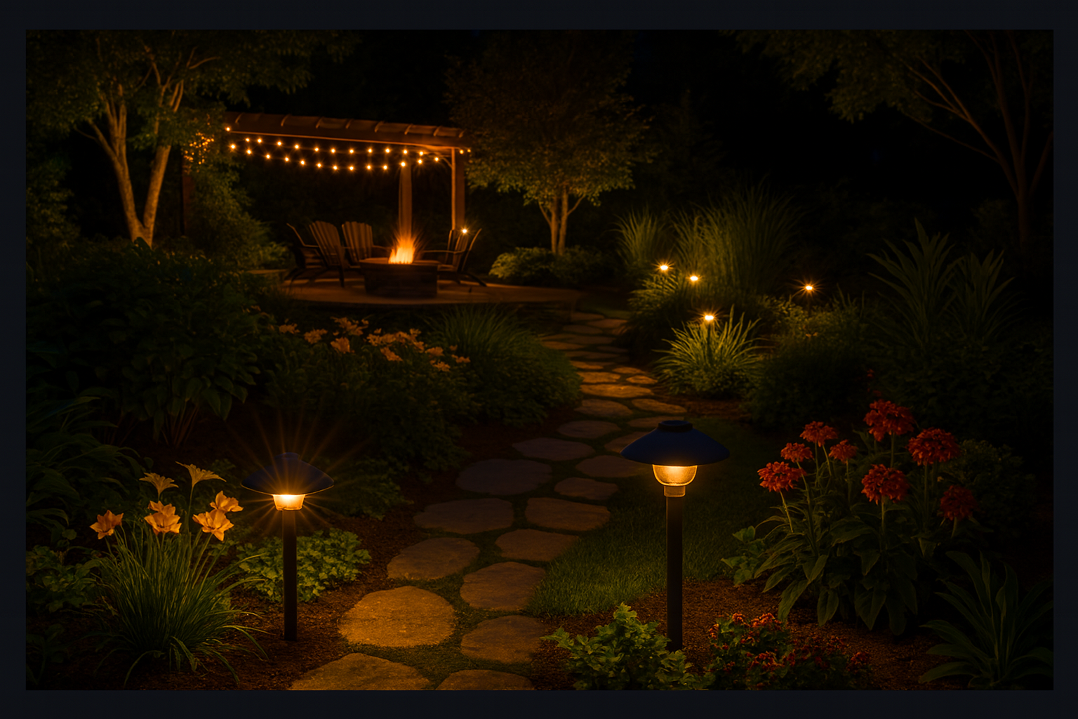 Less is more—don’t flood your yard with light. Use just enough to guide the eye and create atmosphere.