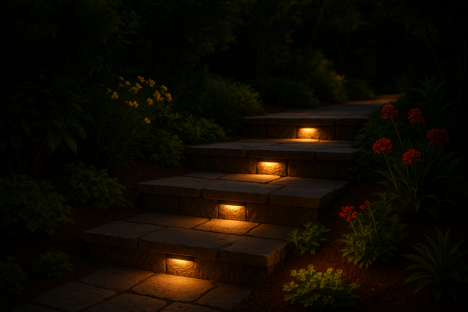 Built-in riser or tread lights on outdoor stairs improve safety and look elegant.