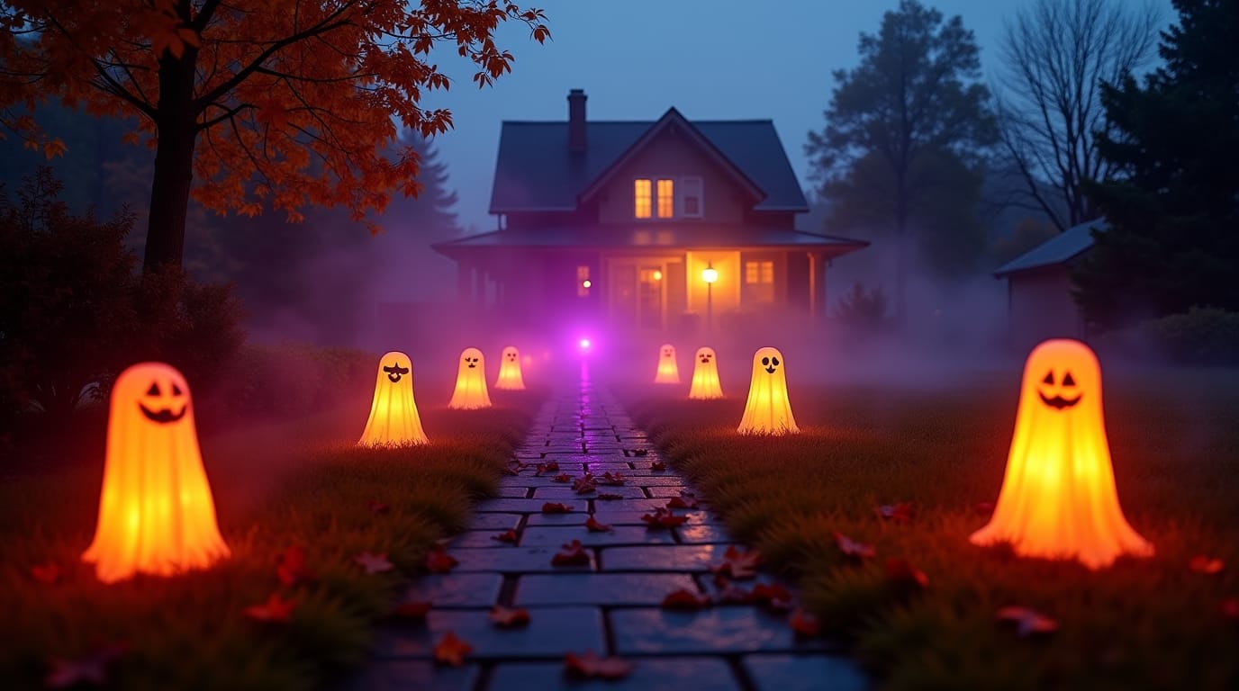 Guide trick-or-treaters safely to your door with themed pathway lights. Options include ghost- or pumpkin-shaped stakes, flickering torches, or even DIY mason jars painted with creepy faces. Adding orange and purple LED bulbs instantly sets a haunting tone.