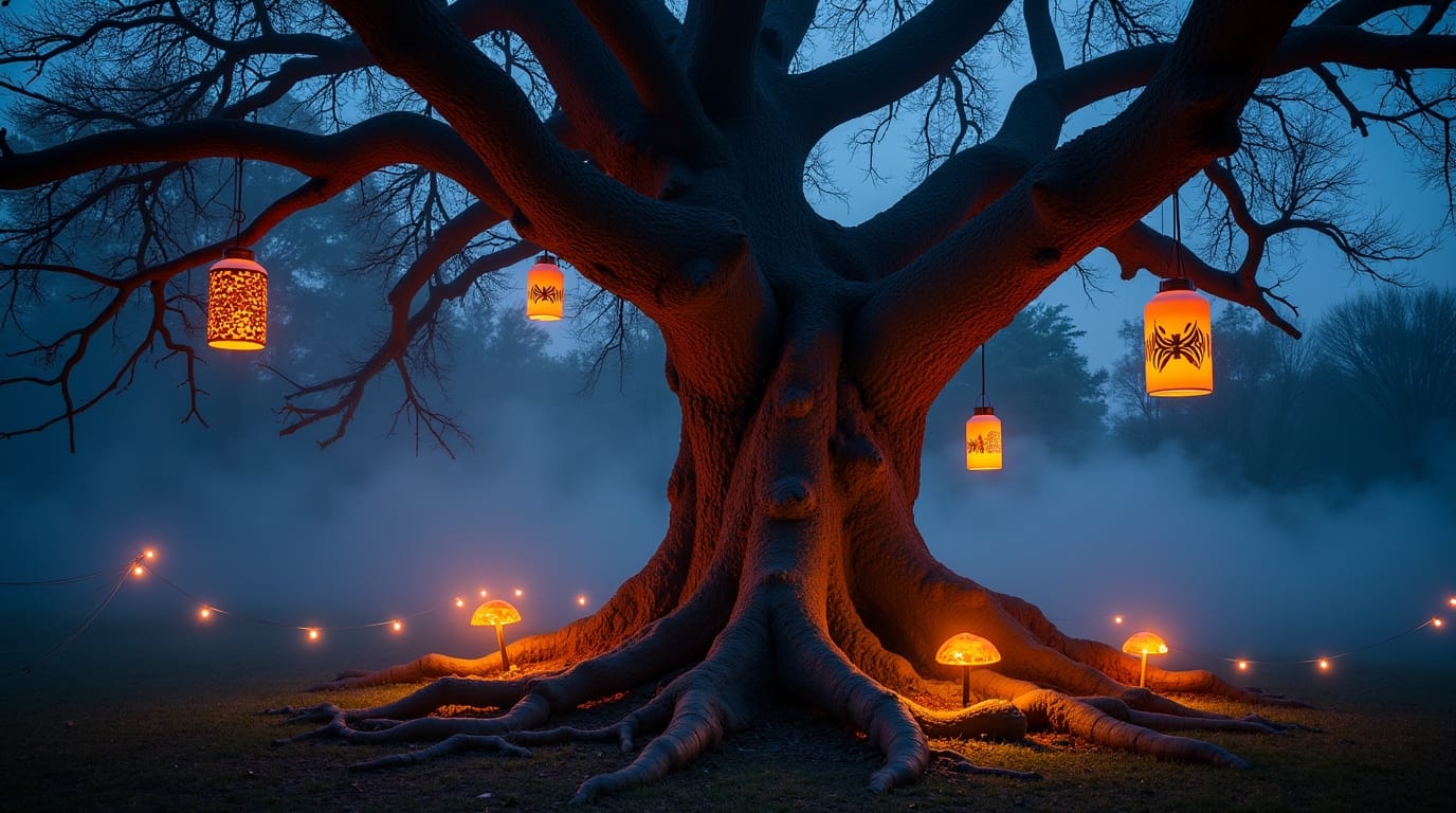 Hang lanterns from tree branches or pergolas to create a floating glow. Spider web string lights or bat-shaped light sets are inexpensive yet eye-catching options that make your garden feel festive.