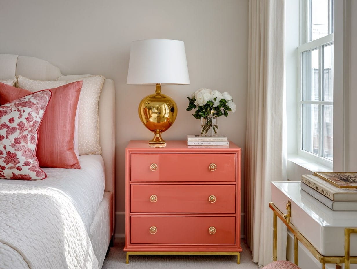 Refresh old furniture with a coat of blush or coral pink paint. Dressers, nightstands, or desks get an instant style upgrade — especially when paired with gold or ceramic knobs.